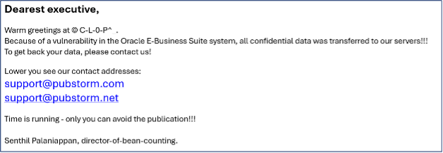 Additionally, the emails sent to victims were abrupt, instructing users to contact Clop at one of two email addresses. Notably, the email body explicitly acknowledged the exploitation of an Oracle E-Business Suite vulnerability.